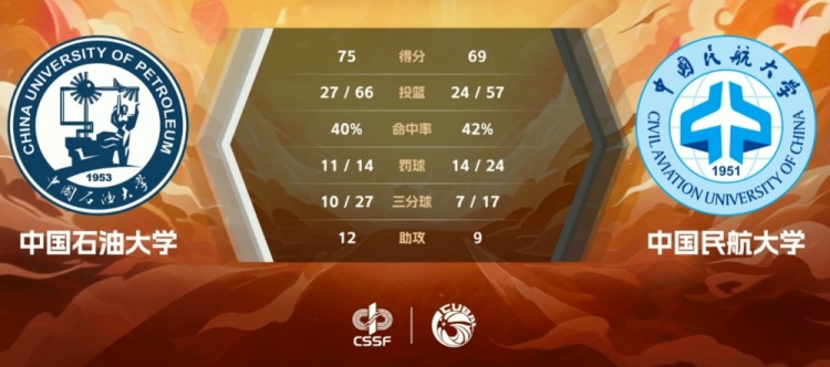 末节对决双方延续拉锯势均力敌,郜周旭手热弧顶命中3+1,也正是这记三分成为比赛转折点,随后郜周旭和张思雨又双双命中三分,中国石大借此送上一波12-2的攻势拉开两位数分差,这之后中国石大一直保持领先优势守住胜利。最终,中国石油大学击败中国民航大学拿下比赛。