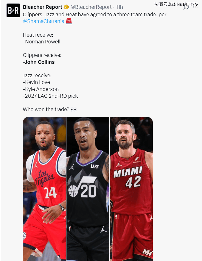 北京时间7月7日晚,热火、爵士、快船完成了一笔三方大交易,鲍威尔去了热火 ,科林斯去了快船,乐福、李凯尔、快船的2027年次轮签去了爵士,这笔交易让洛杉矶快船队得到了一个真正意义上的四号位。