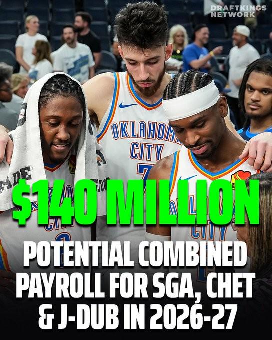 这样一来,算上此前亚历山大签下的4年2.85亿美元续约合同,雷霆队在今年夏天为了续约两大夺冠主力亚历山大和切特已经合计花掉了5.35亿美元。如果雷霆队另一位主力球员杰伦-威廉姆斯也以顶薪价格续约的话,他可以签下5年2.96亿美元的合约。在杰威顶薪续约的情况下,三名主力将在2026-27赛季合计占据1.4亿美元的薪资空间;在亚历山大的大合同在2027年执行时三人将合计占据球队大约1.8亿美元之多的空间,这已经超过了一部分球队全部的薪资总额。