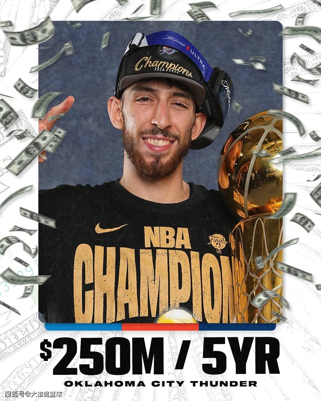 雷霆对于一些出色有天赋的年轻球员,也是非常豪爽,直接给予一份不错的顶薪大合同。比如26岁的亚历山大,这个赛季常规赛和季后赛的表现,都非常出色,还获得了常规赛MVP,总决赛MVP,他为雷霆队带来了球队历史上的第一个总冠军。