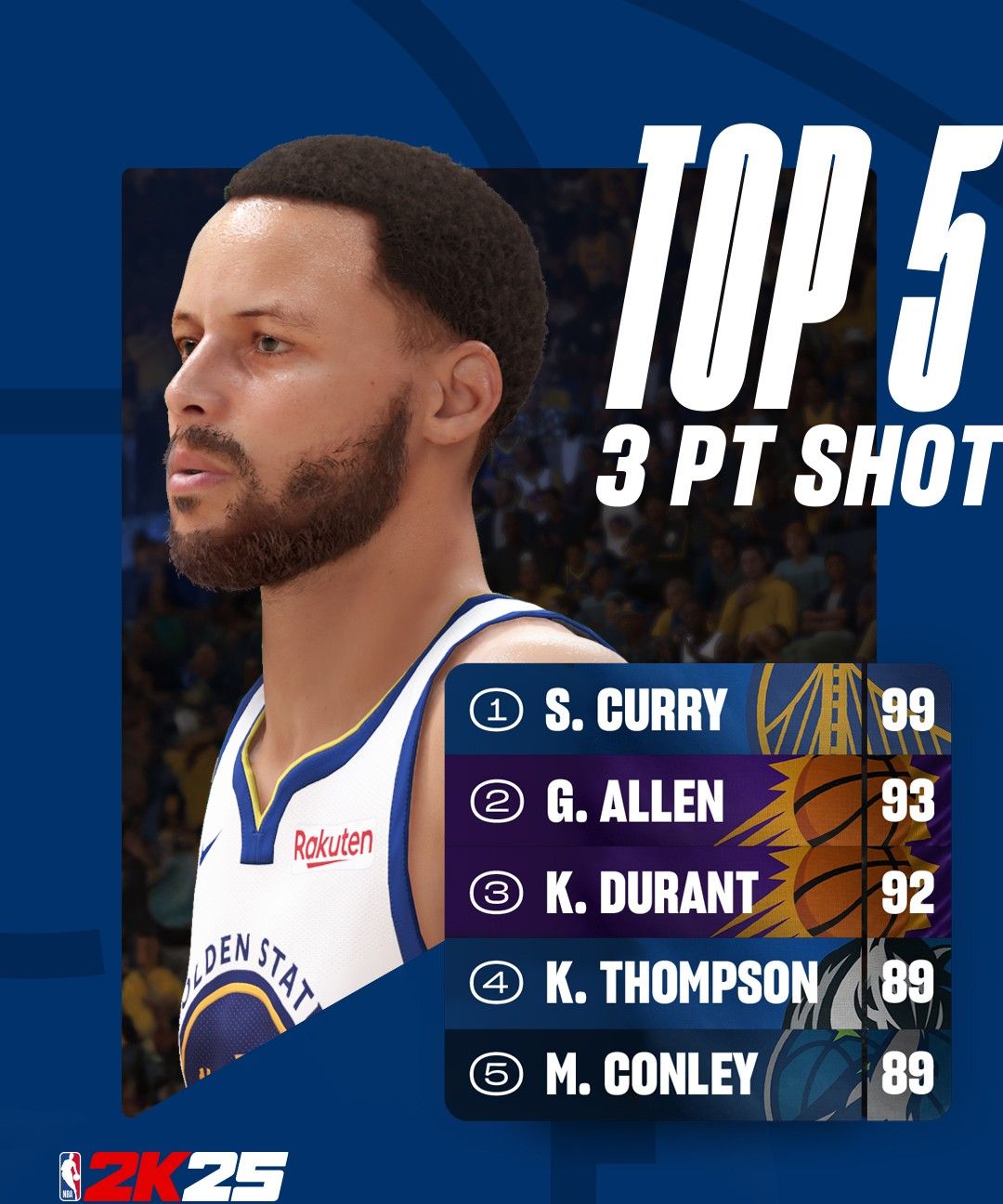 🔥2K25三分能力值前五:库里99第一 阿伦93第二 杜兰特92第三 克莱&康利89