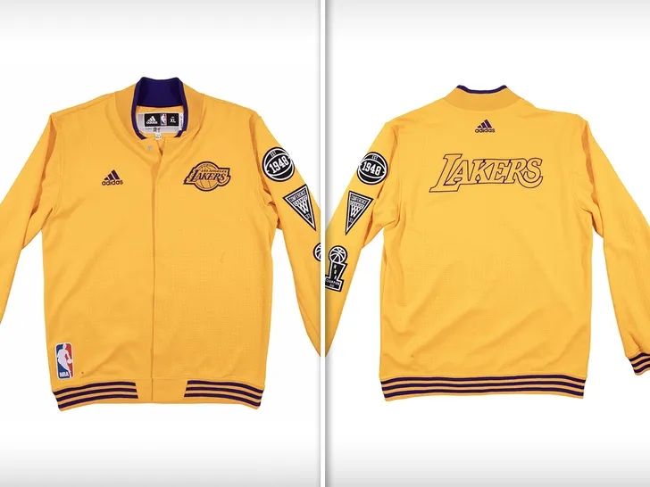 这件金色的阿迪达斯夹克成色非常好,上面的紫色补丁是为了庆祝当时湖人的16个NBA总冠军。