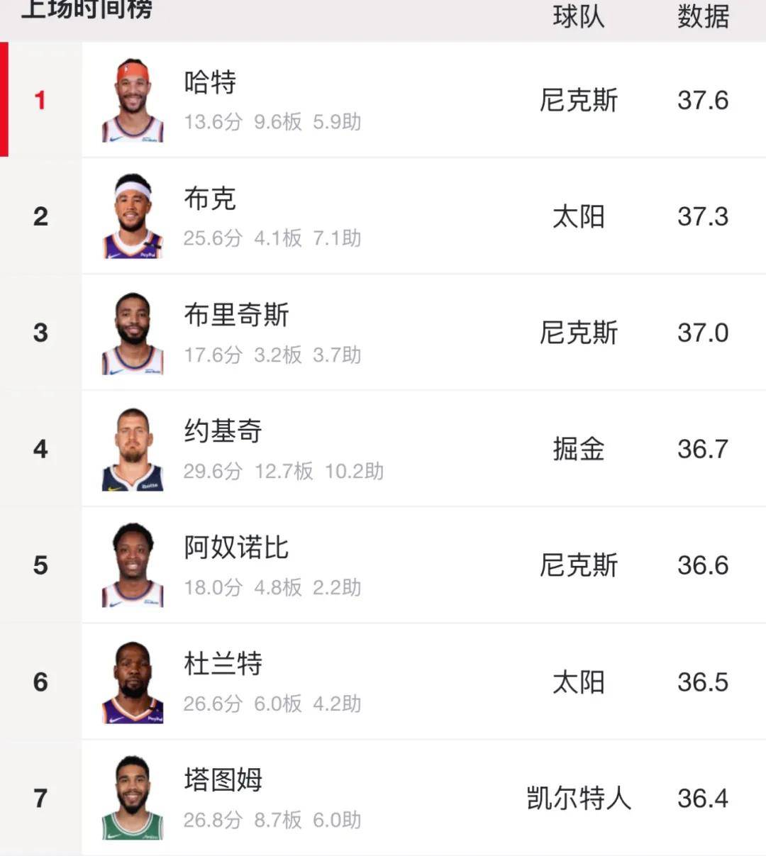 大桥生涯至今从未缺席过比赛,NBA现役第一铁人,连他也顶不住了。本赛季常规赛,哈特场均出战37.6分钟,高居联盟第一;大桥场均出战37分钟,位列联盟第三;阿奴诺比场均出战36.6分钟,联盟第五。这已经能说明问题了!