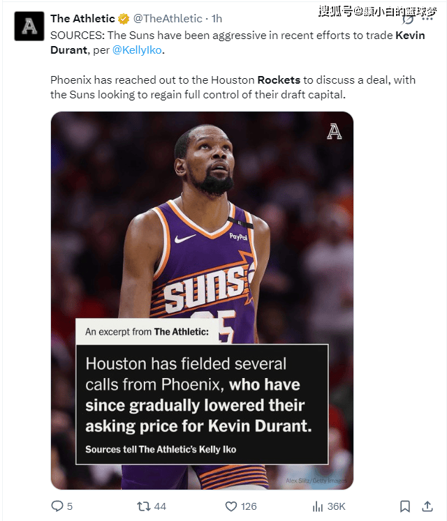 根据凯利-伊科的说法太阳管理层已经多次致电休斯顿火箭队,他们希望能重新掌控未来的选秀权,杜兰特的到期合同是他们的交易筹码,而且太阳已经连续降低了KD的要价,这才让火箭管理层心动。