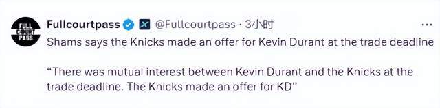 名记Shams率先爆料,尼克斯和杜兰特之间互有意向。根据多方消息透露,早在本赛季交易截止日前,尼克斯就曾向太阳发起过交易杜兰特的尝试,虽然当时未能达成,但在休赛期,双方极有可能再度重启谈判。