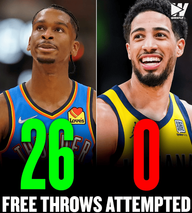 美媒更是晒出了总决赛前三场,亚历山大和哈利伯顿的罚球数对比,前者获得了26次,后者1次都没有。