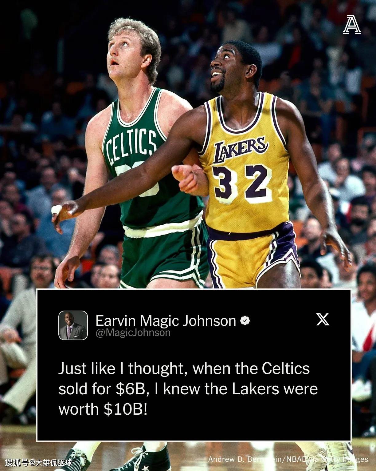 魔术师约翰逊发文表示“正如我所想,当凯尔特人卖60亿美元时,我知道湖人值100亿美元!”