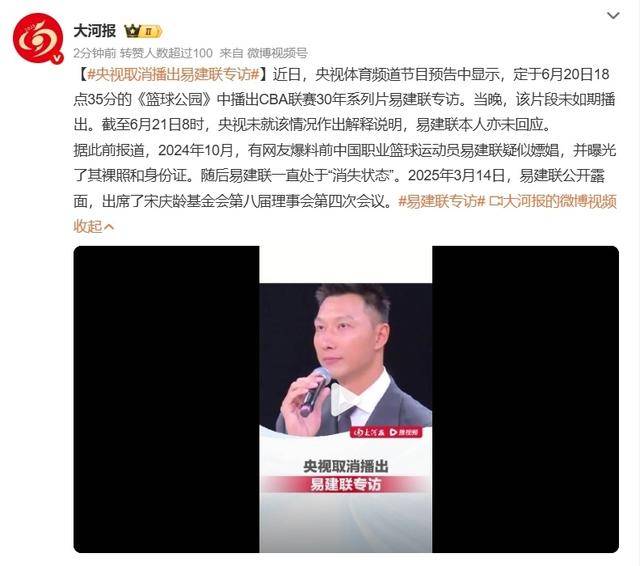 央视体育频道《篮球公园》节目原定于6月20日晚18点35分播出CBA联赛30年系列片《青春30年》,其中包含对前中国男篮核心球员易建联的专访,然而,当节目准时播出后,等候多时的球迷却发现易建联的专访部分被临时取消,取而代之的是其他篮球内容,多位篮球媒体人当晚在社交媒体上证实:“据了解,原来定于今晚播出的易建联专访不会播了,未来是否有安排,不知。”这一突发变动引发球迷热议,许多人调侃“央视也开始做假动作了”