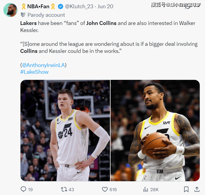 一天之前,湖人记者安东尼-劳瑞恩透露,湖人队已经与爵士队讨论过关于八村垒换约翰-科林斯的交易,这笔交易如果达成,湖人的四号位有了尺寸的升级,科林斯是一位裸足2.08米足尺寸的PF,而八村垒是2.03米的四号位。