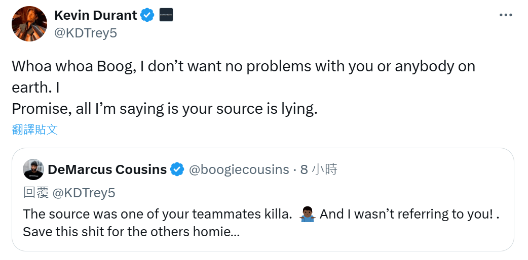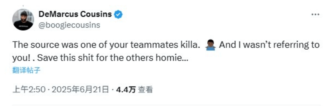 但考辛斯不甘示弱,接着回应称消息源来自杜兰特的一个队友,“ 而且我说的不是你杜兰特... 省省吧兄弟,把这套留给其他人吧”。