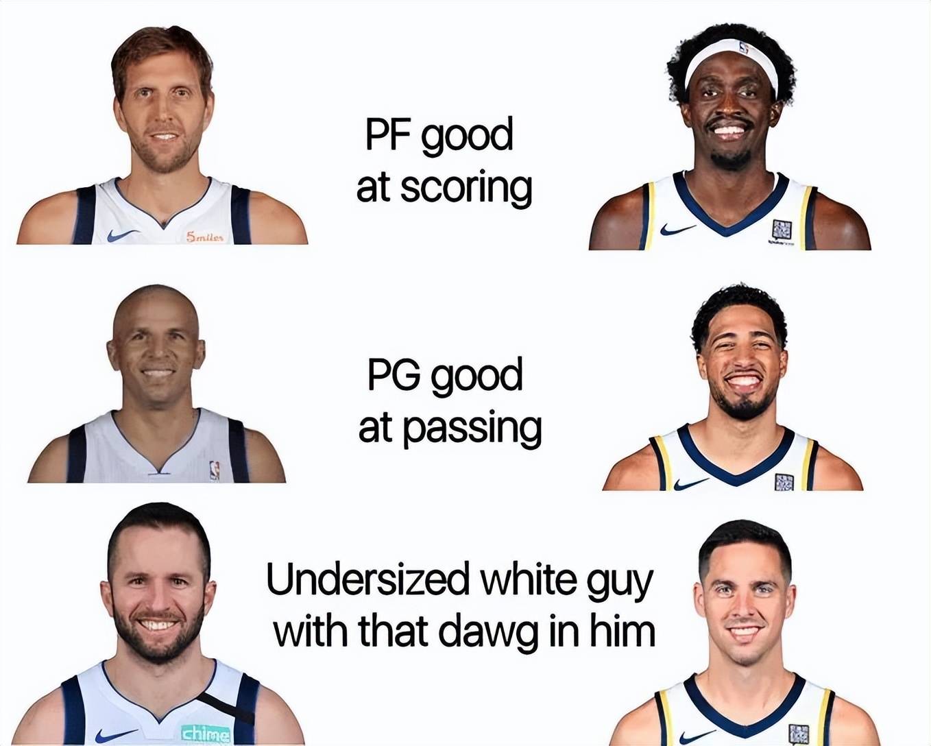 北京时间6月21日,美媒NBA Memes发图对比:2011年的独行侠和2025年的步行者有着惊人的相似之处,擅长得分的大前锋,诺维茨基和西亚卡姆,擅长传球的控卫,基德和哈里伯顿,以及充满拼劲的矮个子白人球员,而且最重要的是两支球队的主教练都是卡莱尔,当时卡莱尔带领那支小牛战胜了开拓者、湖人,雷霆,并且在总决赛击败了三巨头领衔的热火,拿下了总冠军。
