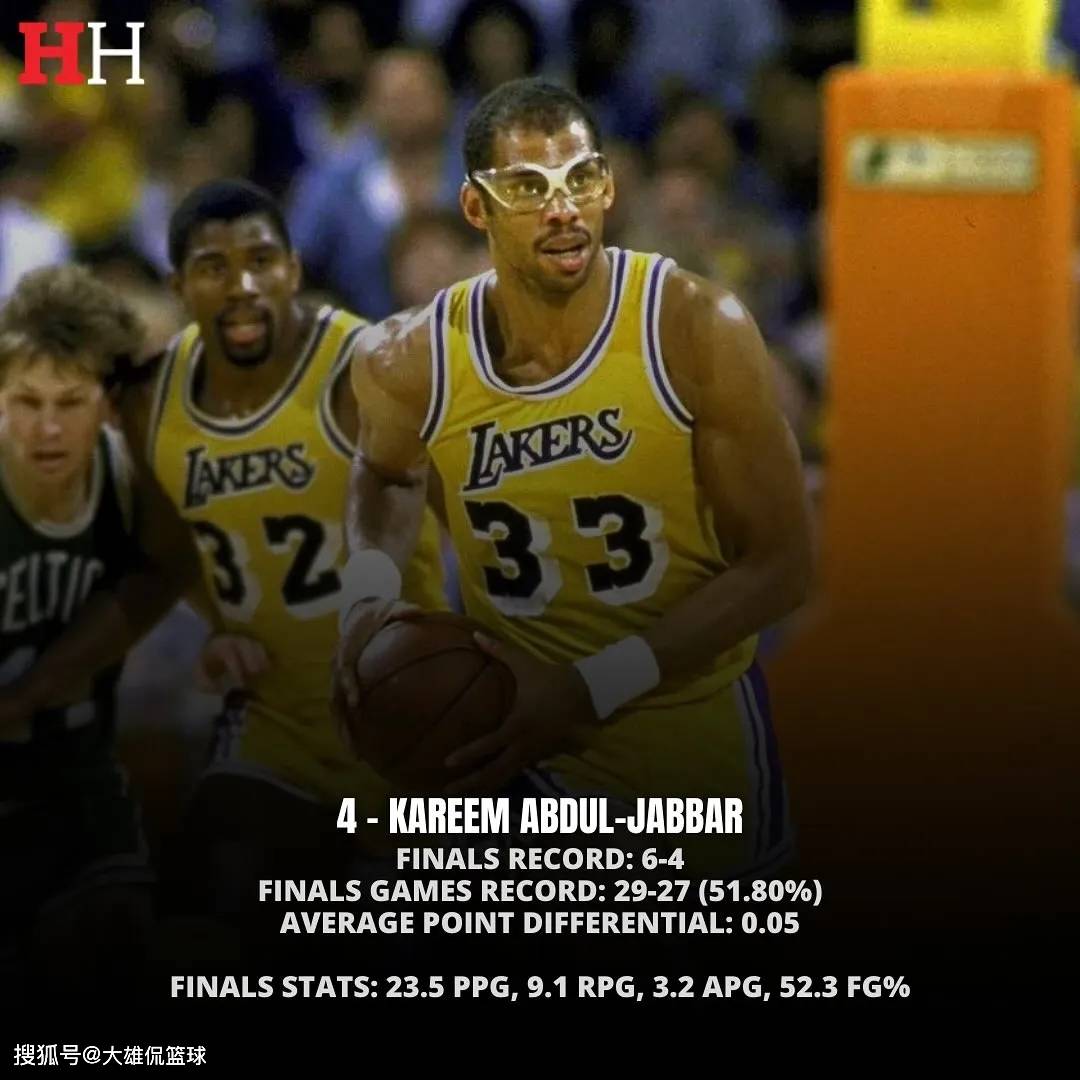 贾巴尔职业生涯10进总决赛,六次赢得NBA总冠军。作为NBA历史上最伟大的得分手之一,在勒布朗詹姆斯超越他之前,他可是历史得分第一名。他曾在密尔沃基雄鹿,拿到了个人职业生涯第一座总冠军和总决赛MVP,后来加入湖人,搭档魔术师约翰逊,又拿到了五座总冠军。