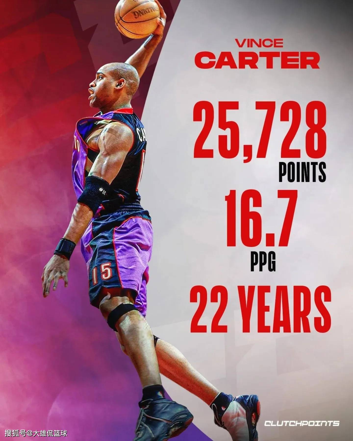 NBA职业生涯22个赛季,场均16.7分,一共拿到了25728分。文斯卡特是21世纪最伟大的四大分卫之一,职业生涯虽说没有拿到过总冠军,可他NBA唯一一个打了四个时代不同的NBA球员。