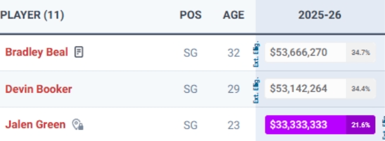 但这是非常危险的阵容,要是太阳没有送走比尔,那么他们的现有阵容在下赛季的年薪前三位就是比尔的5366万美元、布克的5314万美元和杰伦·格林的3333万美元。