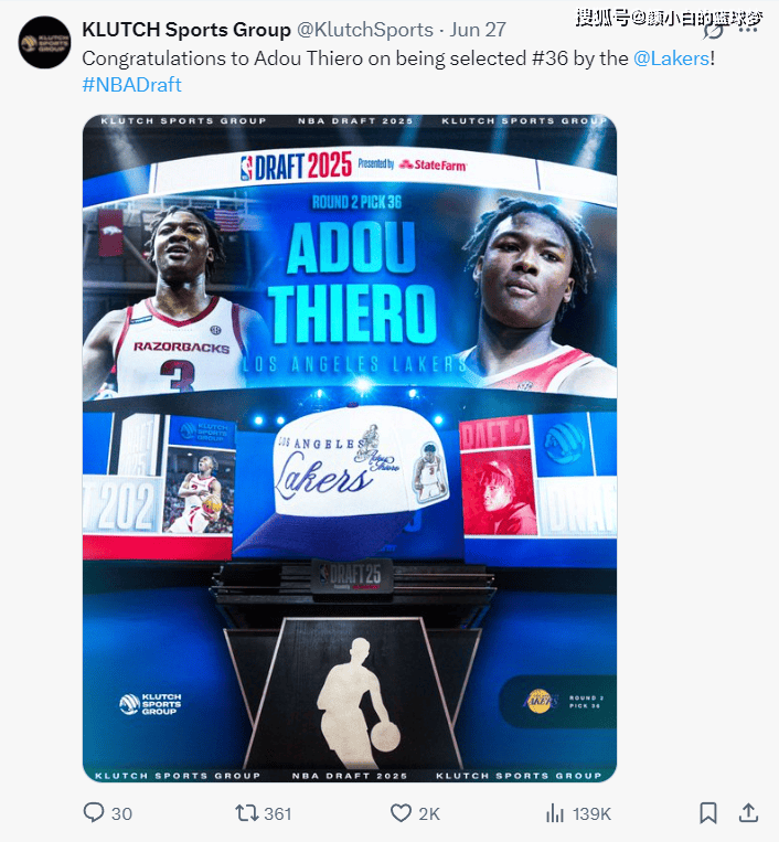 今年的选秀大会分为两天,湖人次轮36号签选中的蒂耶罗就是来自Klutch Sports Group。
