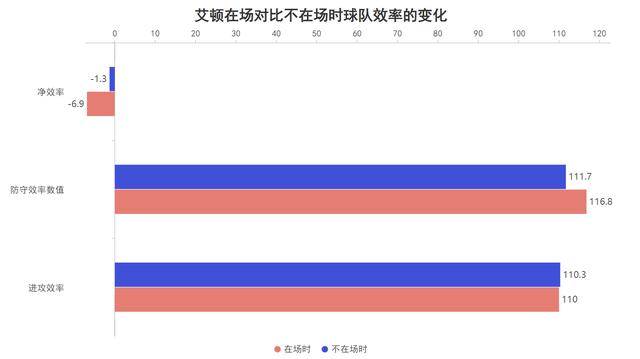 当然,对中锋球员来说只看数据也有失偏颇,赛场作用也是很关键的考量因素:上赛季当艾顿在场与不在场时,开拓者的进攻效率为110与110.3,防守效率数值为116.8与111.7,净效率数值为负6.9与-1.3。