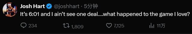 尼克斯球员哈特在社媒发文:“现在已经6点01了,我还没看到一笔交易发生,我最喜欢的篮球怎么了?