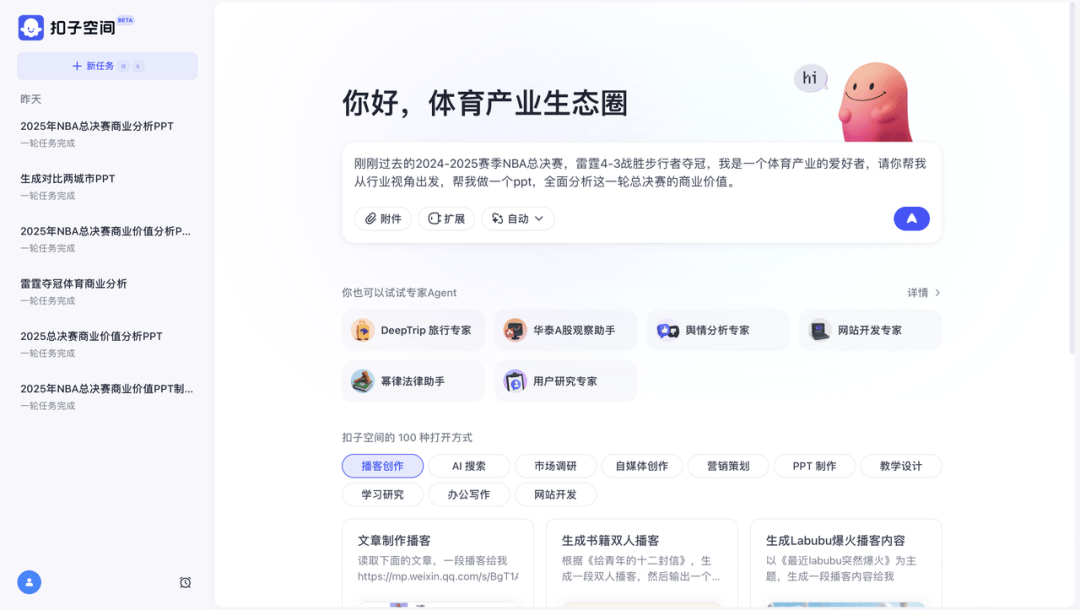 最好的证明,便是球票的售卖情况。为了更直观地了解总决赛期间具体的上座情况,我们打开了适合许多工作场景的AI工具——扣子空间,准备用他们最新的PPT制作功能一探究竟。