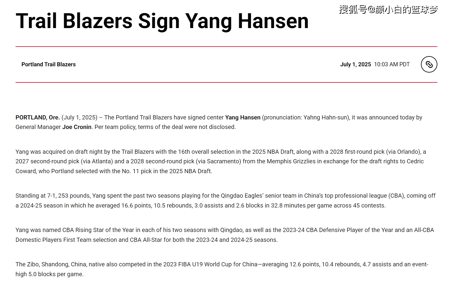 开拓者官方写道:开拓者已经签下杨瀚森,由总经理乔-克罗宁根据球队的政策签约杨瀚森,签约的细节条款没有披露。