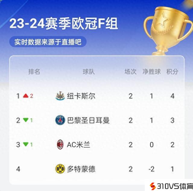 欧冠F组实时积分榜:纽卡力压巴黎米兰多特登顶死亡之组