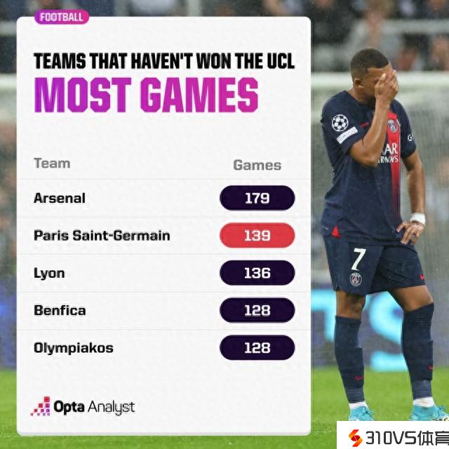 未夺欧冠球队竞赛场次排行榜:阿森纳最多,巴黎次席