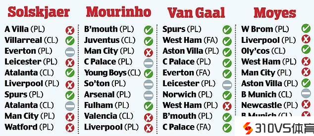 《每日邮报》清点了过去四任曼联正式主帅在球队最后10场竞赛的战绩。