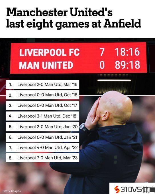 再看看这8场竞赛的详细战绩:0-7惨败,0-4大败,0-0,0-2,1-3,0-0,0-0,0-2,曼联一共就打入1球,而且最近4场0球,上一次在安菲尔德破门,还是2018年12月17日,整整5年之前!一共丢了多少球呢?18个!