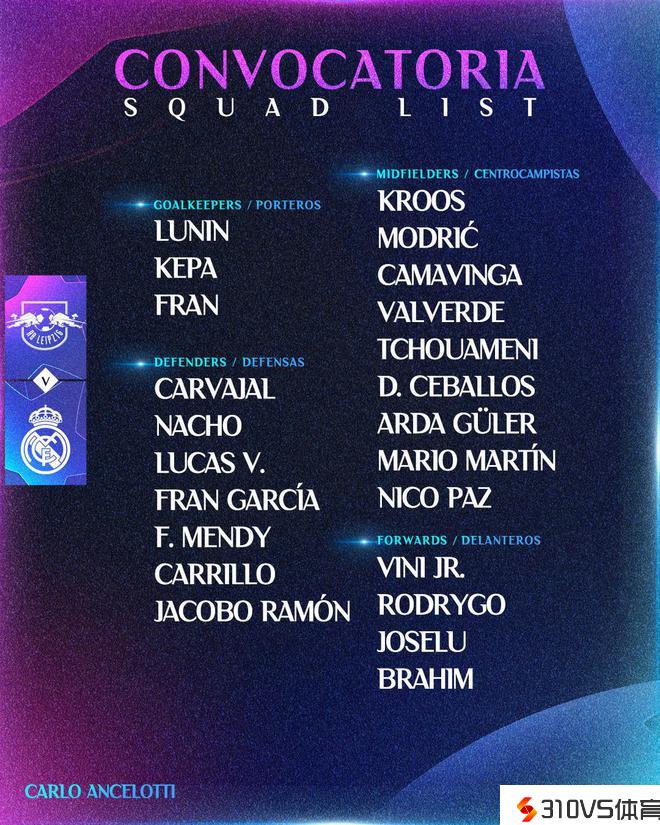 皇马欧冠客战莱比锡大名单:维尼修斯领衔,贝林、吕迪格伤缺