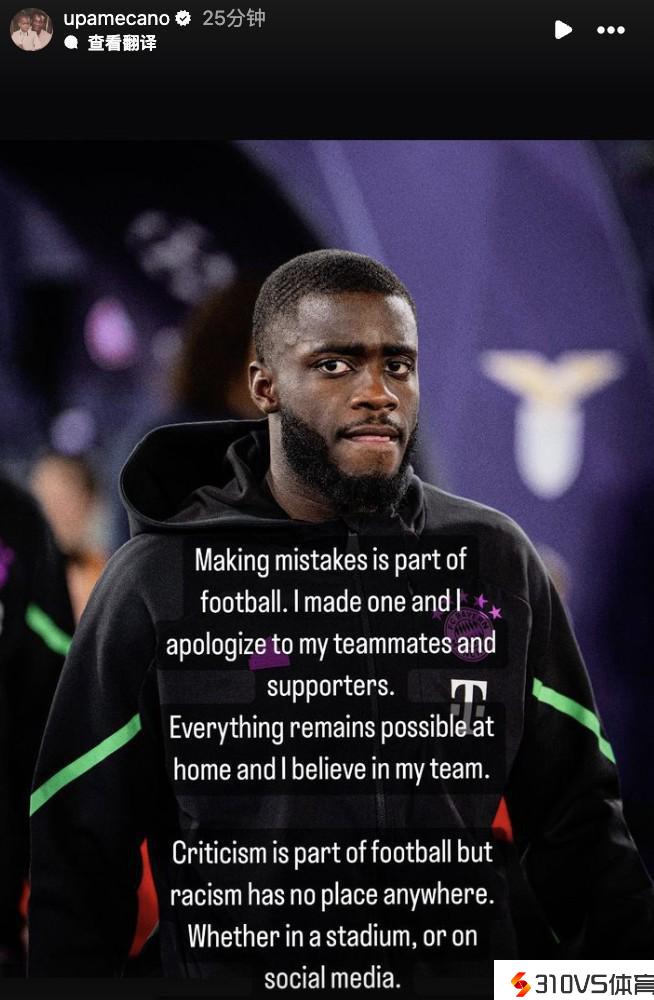 欧冠染红送点,于帕:为我犯的错误抱歉,但种族歧视不应存在