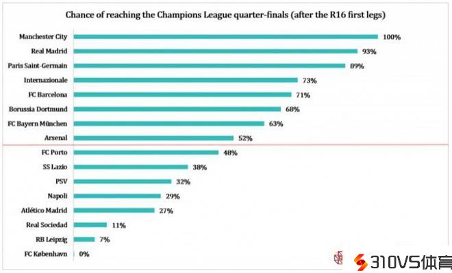 欧冠各队晋级概率:曼城100%&皇马93%,巴萨71%&枪手52%