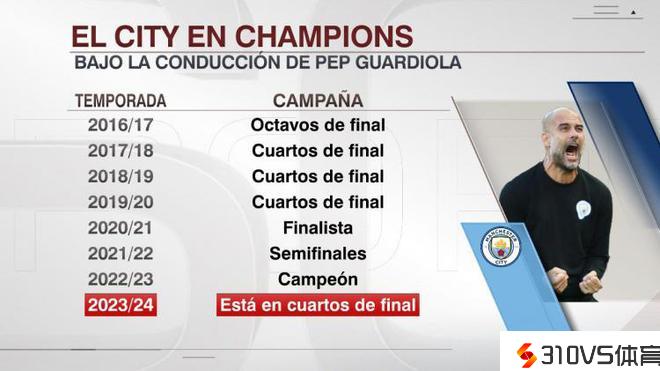 瓜帅率领曼城延续7年晋级欧冠8强,过去3个赛季1冠1亚