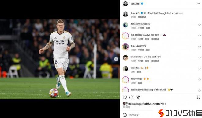 直率!克罗斯社媒晒照:有点小运气,不过还是顺利晋级8强