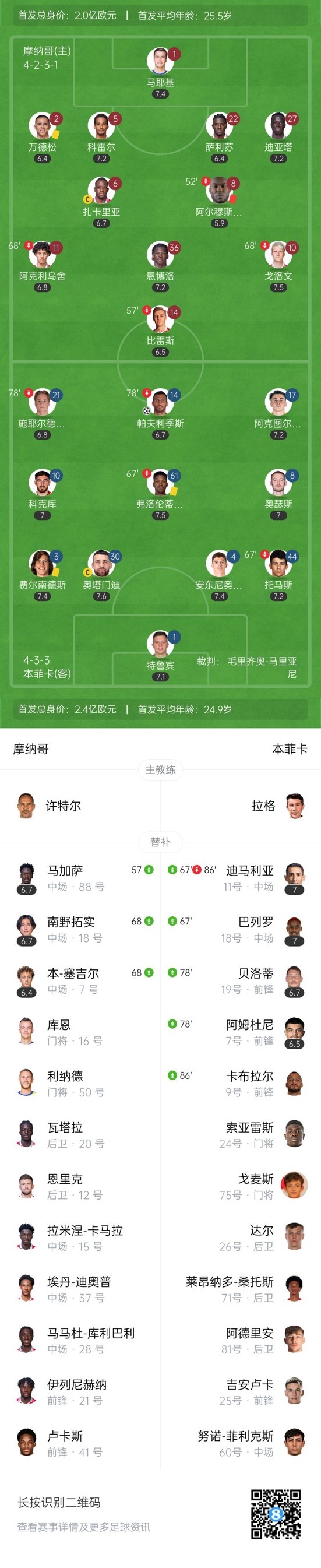 下半场补时6分钟,摩纳哥0-1本菲卡。