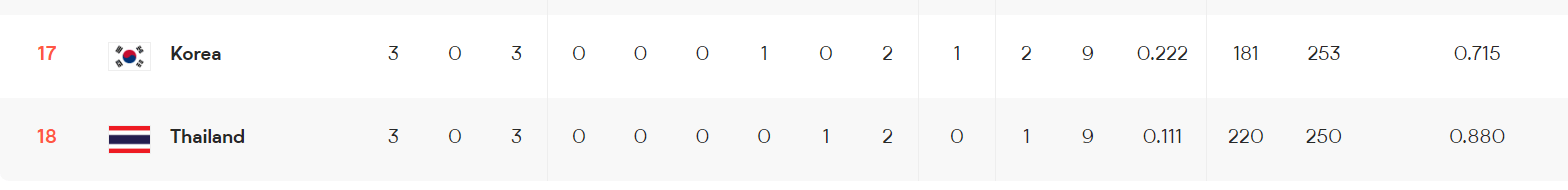 泰国与韩国都是3连败,不过韩国有一场2-3,泰国是1-3,所以目前垫底的是泰国队。