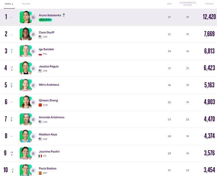 在温网止步四强的萨巴伦卡,本周继续以巨大优势排名世界第一的位置。尽管高芙在温网遭遇一轮游,但她仍以7669分排名世界第2位。斯瓦泰克在温网夺冠打破13个月冠军荒,重新回到了世界前3的位置。佩古拉下滑1位来到世界第4,小将安德列娃升至世界第5创新高。