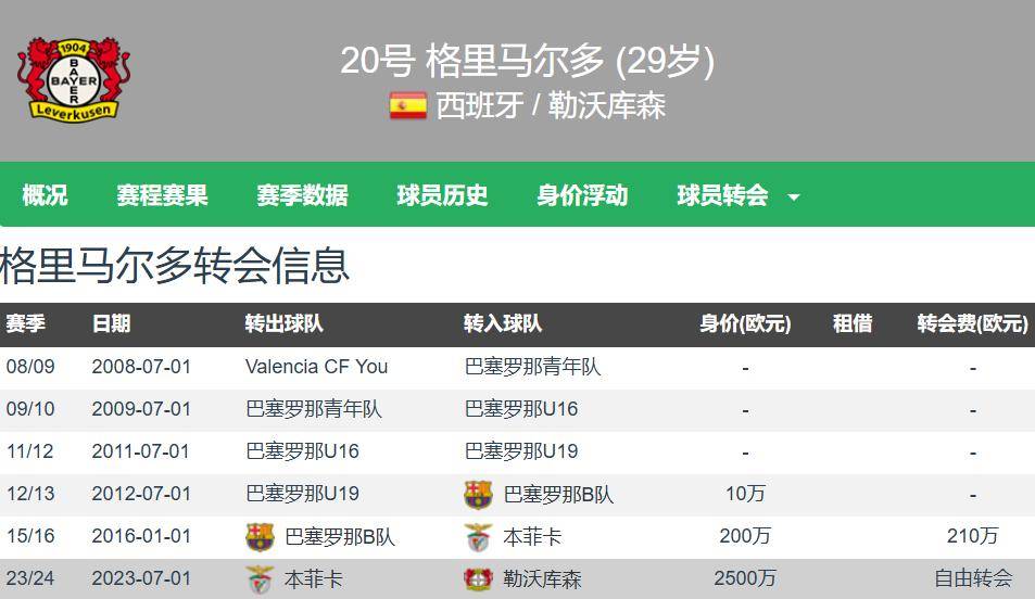 格里马尔多现年29岁,左脚球员,主打左后卫,也可以踢左中场,身高1.71米,德转估价4000万欧元,解约金不足2000万欧元,如今的皇萨都在免签以及签下性价比高的球员。格里马尔多只要半价即可签下,还是西班牙国脚,巴萨和皇马都会心动。格里马尔多本赛季各项赛事共为勒沃库森出场48场,贡献4球12助。由于药厂面临阵容瓦解,格里马尔多也渴望离队加盟更有竞争力的球队。
