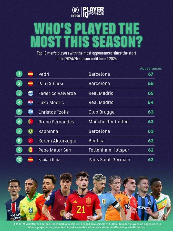 来自国际职业足球运动员联合会发布了一组海报,展示了过去一个赛季出场最多的10位球员,佩德里以赛季出场67次独占C位,排名紧随其后的是18岁的库巴西和皇马的巴尔韦德以及莫德里奇。这张海报一经公布很快就引起了球迷的讨论,“佩德里被过度使用”这个话题也再次成为了焦点,是否应该让球员获得更多的休息时间也再次成为了舆论的焦点。
