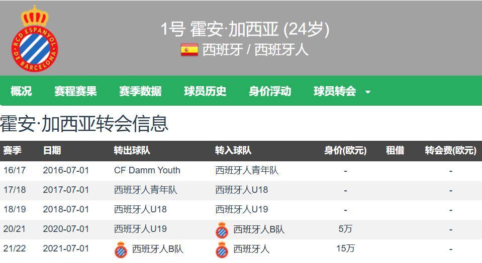 现年24岁的霍安-加西亚,身高1.91米,右脚门将,与西班牙人的合同至2028年,德转估价2500万欧元。霍安-加西亚出战了上赛季全部的38场西甲的比赛,取得8场零封,丢了51球,场均丢了1.34球。