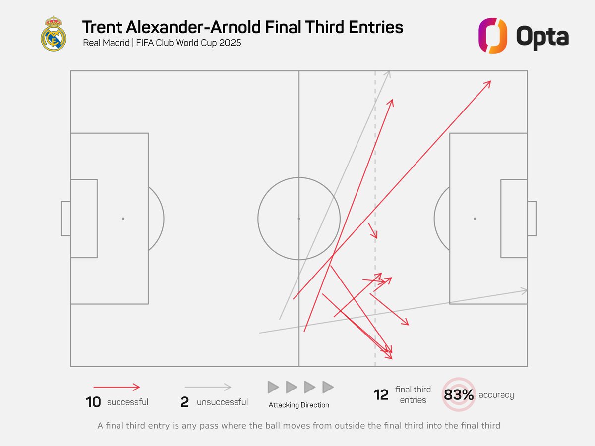 据Opta数据统计,阿诺德本场比赛传入前场进攻三区的传球中成功率达83%,其中10次成功、2次失败。