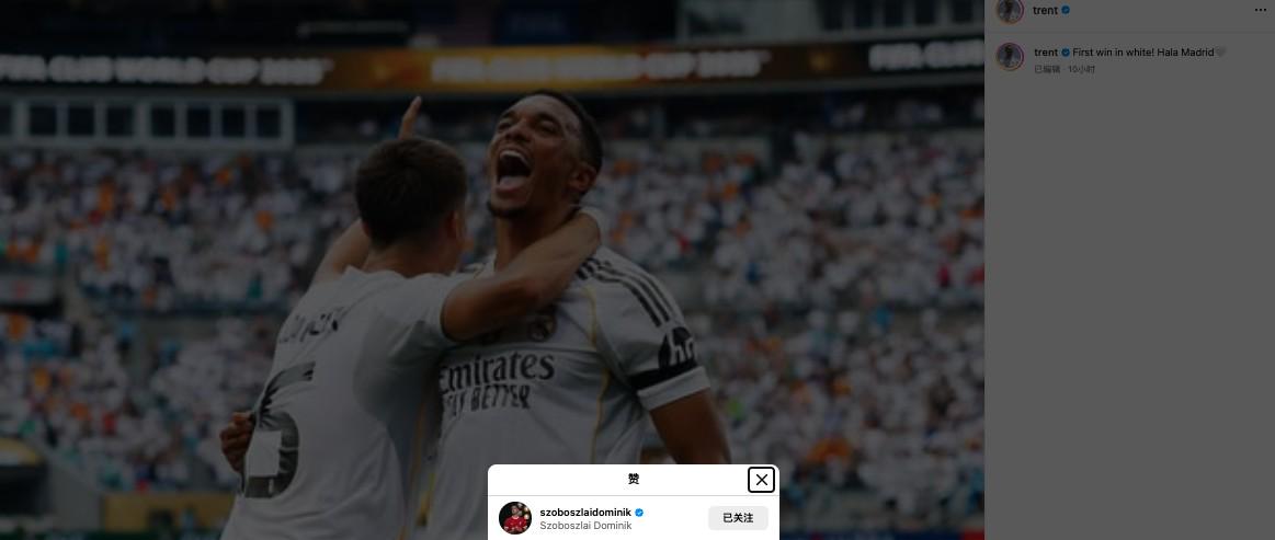 收获皇马生涯首胜的阿诺德在社交媒体庆祝胜利,这位皇马后卫发布的图片是和居莱尔一起庆祝的照片,而点赞列表中出现了阿诺德的利物浦前队友索博斯洛伊。