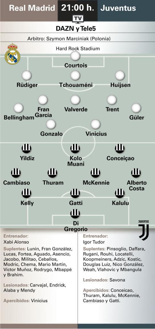 一切都表明阿隆索将重复对阵萨尔茨堡时行之有效的首发十一人阵型和体系,包括由吕迪格、楚阿梅尼和赫伊森组成的三中卫,两名边翼卫(弗兰-加西亚和阿诺德),以及由巴尔韦德、居莱尔和贝林厄姆组成的中场。贡萨洛是皇马最重要的球员之一,他将在世俱杯上第四次首发,与维尼修斯搭档锋线。不出意外,罗德里戈将继续坐在替补席上,他在过去两场比赛中都坐在替补席上。皇马和尤文图斯将全力以赴,争取进入四分之一决赛。