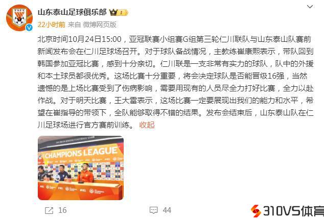 聚焦亚冠:仁川联主帅点评崔康熙,泰山队首收回炉,执法裁判确定