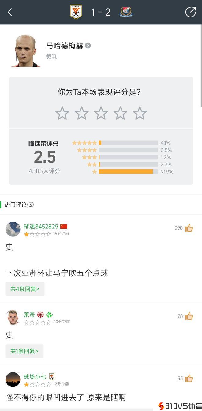 我懂球迷对山东vs横滨水手主裁评分仅为2.5,92%球迷给出一星