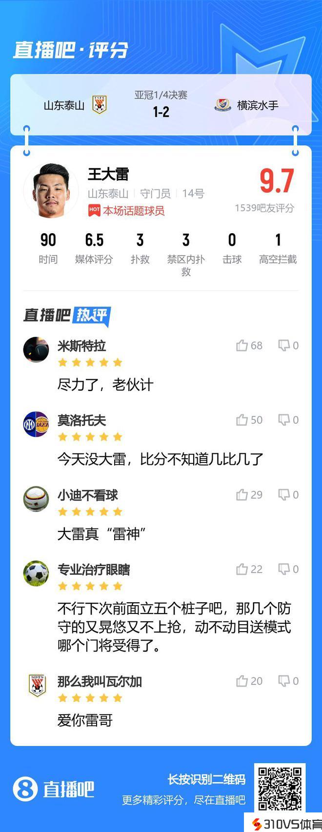 吧友为王大雷打9.7分:真“雷神”,不行下次前面立5个桩子吧