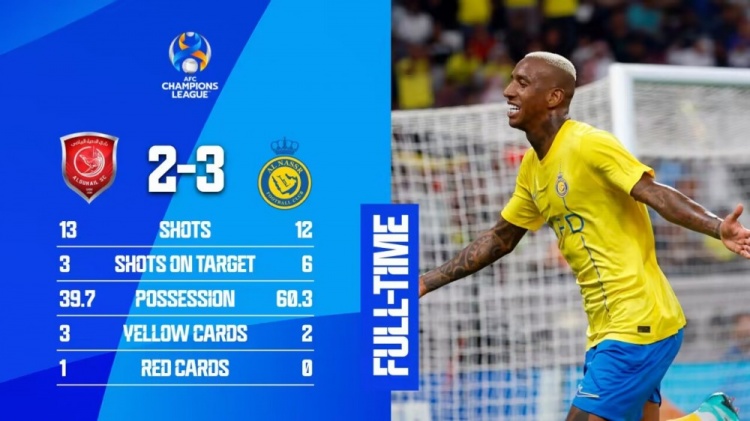 亚冠-利雅得胜利3-2杜海勒4战全胜 C罗轮休塔利斯卡戴帽库鸟双响