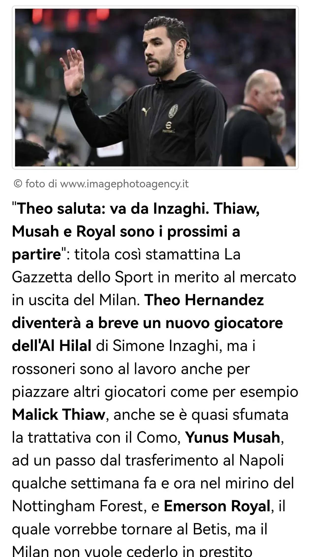《米兰体育报》今日以“特奥告别:投奔因扎吉。佳夫、穆萨和罗亚尔将是下一批离队者”为题,报道了米兰的转出市场情况。特奥·埃尔南德斯即将成为西蒙尼·因扎吉执教的利雅得新月的新球员,而红黑军团也在着手处理其他球员的转会事宜,比如马利克·佳夫,尽管与科莫的谈判已基本告吹;尤努斯·穆萨。