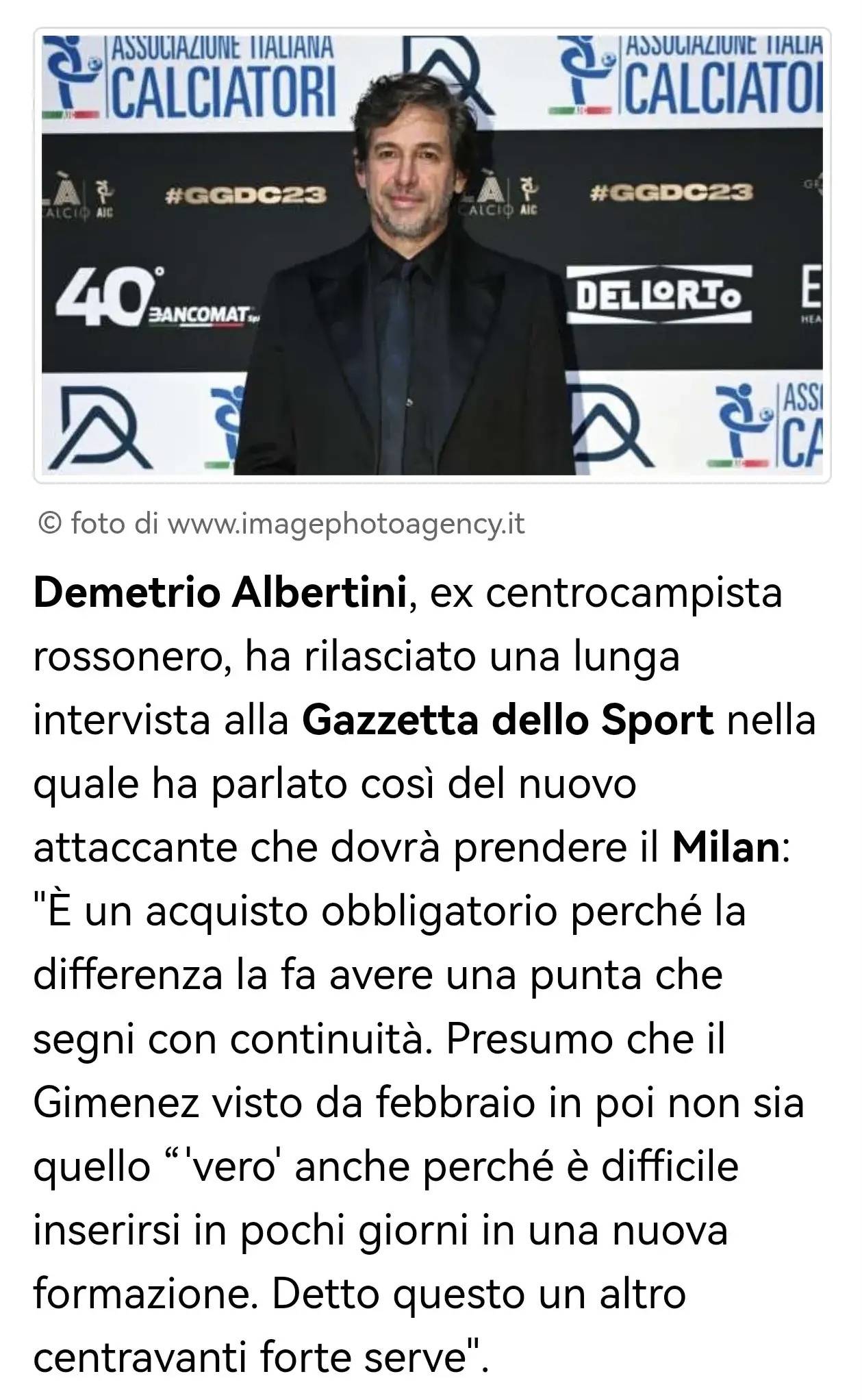 德梅特里奥·阿尔贝蒂尼,前米兰中场,在接受《米兰体育报》的长篇采访时,这样谈及米兰需要引进的新前锋:“这是一笔必须完成的引援,因为一名能持续进球的前锋会带来不同。