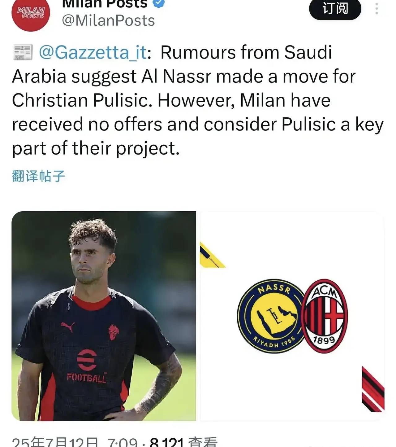 意甲媒体透露:利雅得胜利俱乐部希望在新赛季有所作为,准备报价米兰球员普利西奇