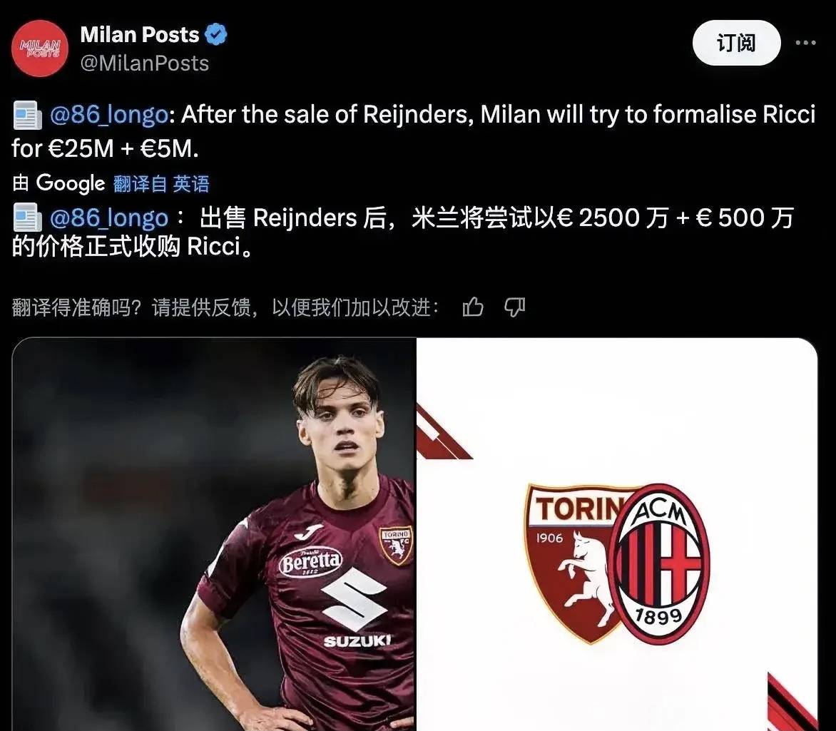 意甲媒体透露:米兰对里奇的报价大概为2500万欧元加500万欧元奖金,他是雷恩德斯的替代者
