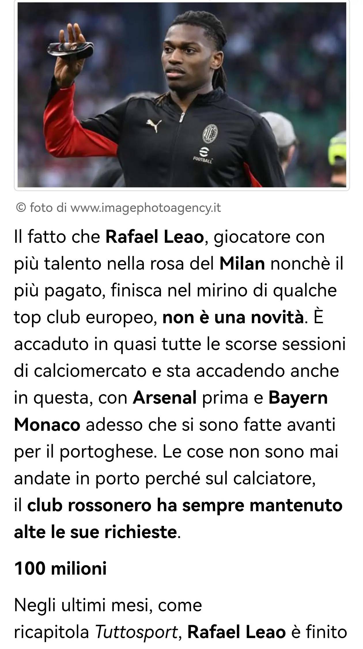 拉斐尔·莱奥作为米兰阵中天赋最高且薪资最高的球员,成为欧洲顶级俱乐部的引援目标早已不是新闻。过去几个转会窗口几乎次次如此,本赛季亦不例外——阿森纳率先表态,如今拜仁慕尼黑也加入争夺。不过红黑军团始终未放行,只因俱乐部对这位葡萄牙边锋的要价始终居高不下。